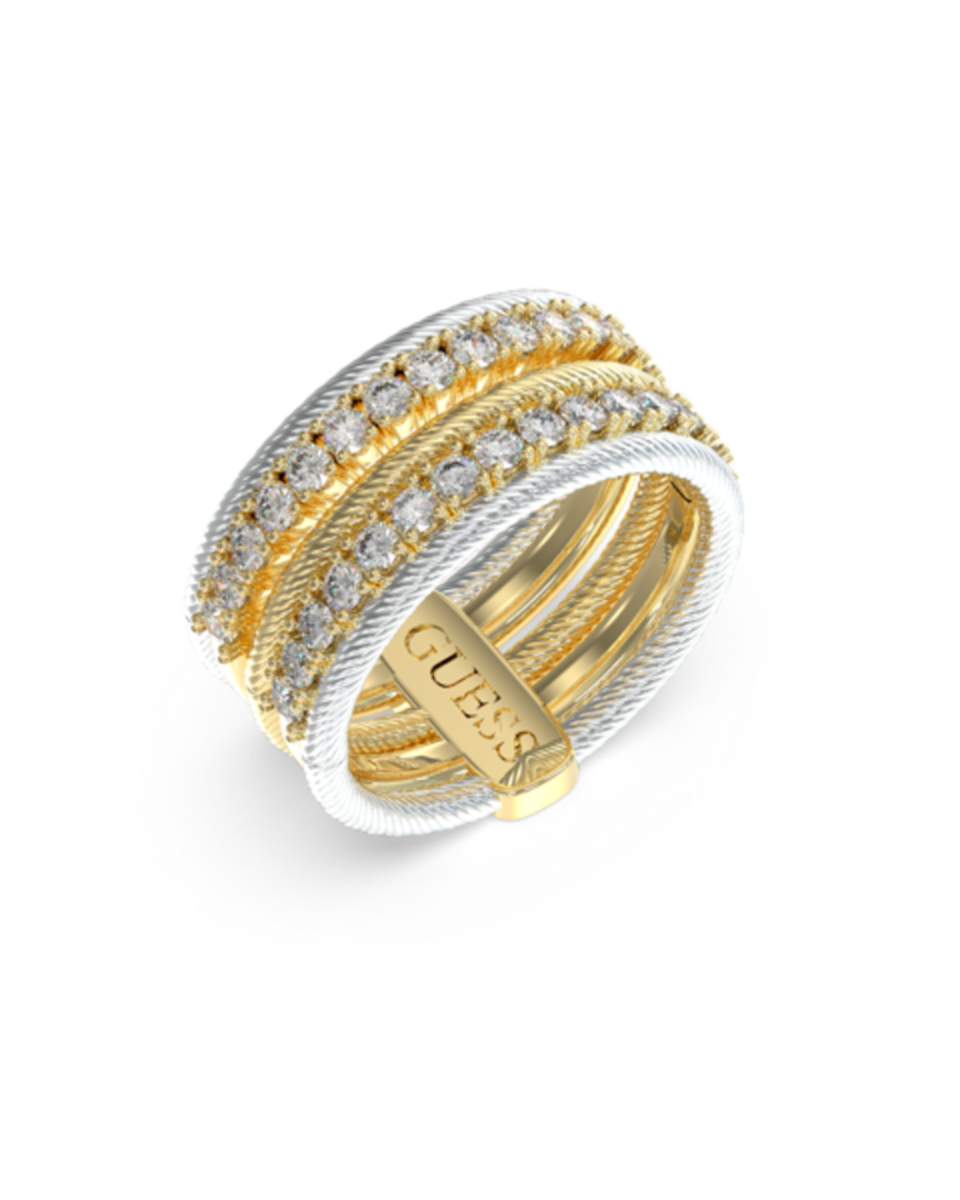 Anillo de acero para mujer de la marca Guess. Anillo dorado y plateado de cable doble con piedras decorativas. Talla 54. El estilo y el diseño toman forma en esta colección Kalybe gracias al uso de una especial cadena en forma de cable.