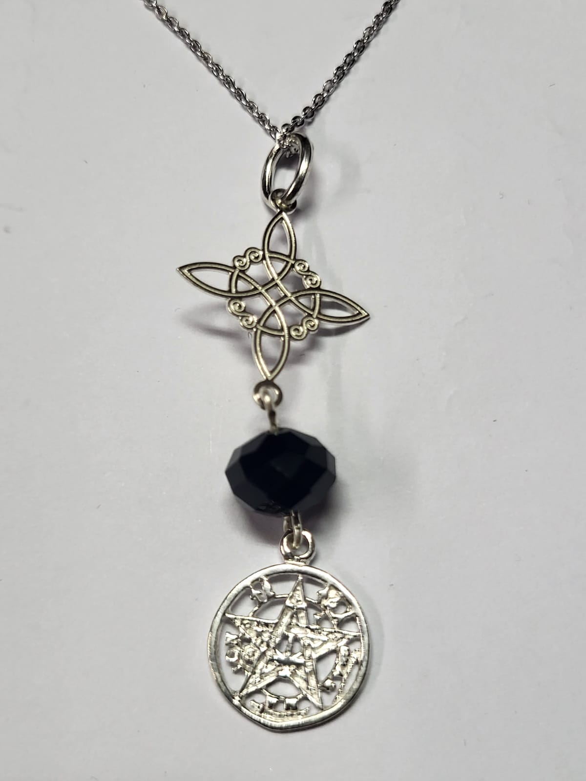 Colgante protección de Nudo de Brujas, Onix y Tetragramatón en plata de ley 925. 60mm. (Precio sin cadena)