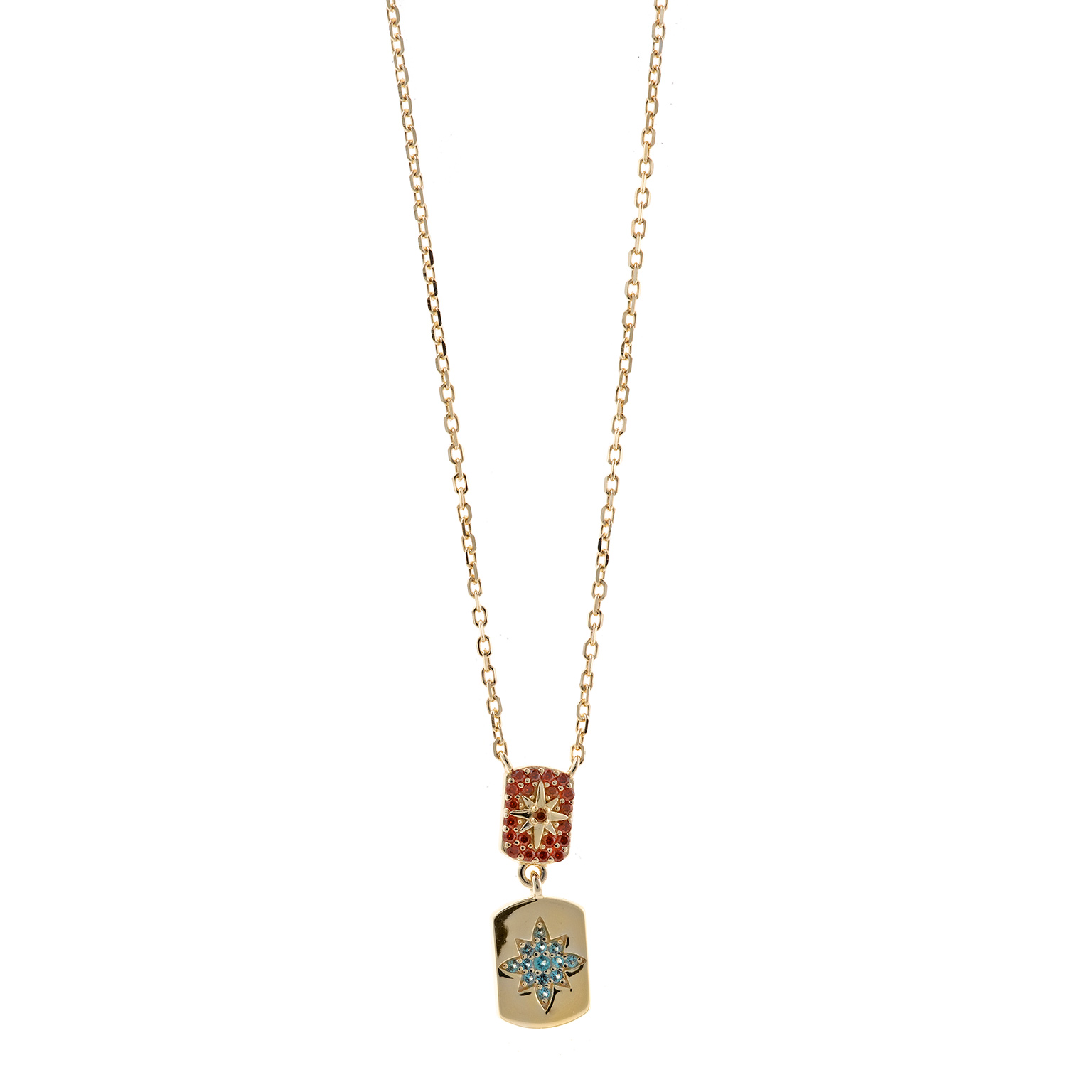 COLLAR PLATA CHAPADO DORADO RECTANGULOS ESTRELLA CIRCONITAS PARAIBA CENTRO ROJA BRILLANTES