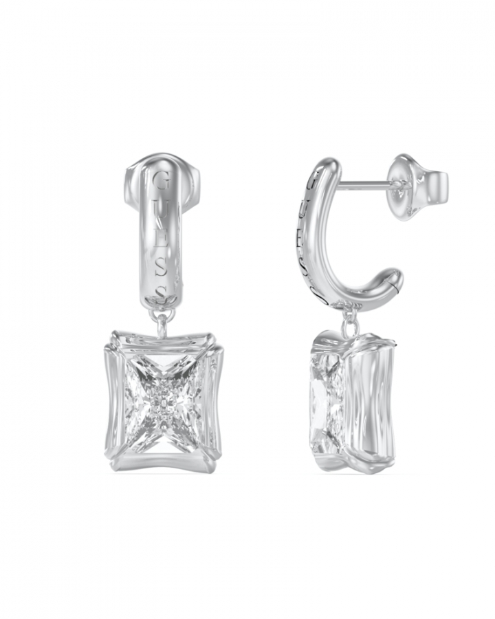 Pendientes de acero para mujer de la marca Guess. Pendientes huggies plateados con colgante de cristal de baguette blanco rodeado de diseño de bambo palteado. Cada pieza de la colección Bamboo está diseñada para reflejar la riqueza y abundancia que el bambú representa, aportando un toque de sofisticación a tu estilo.