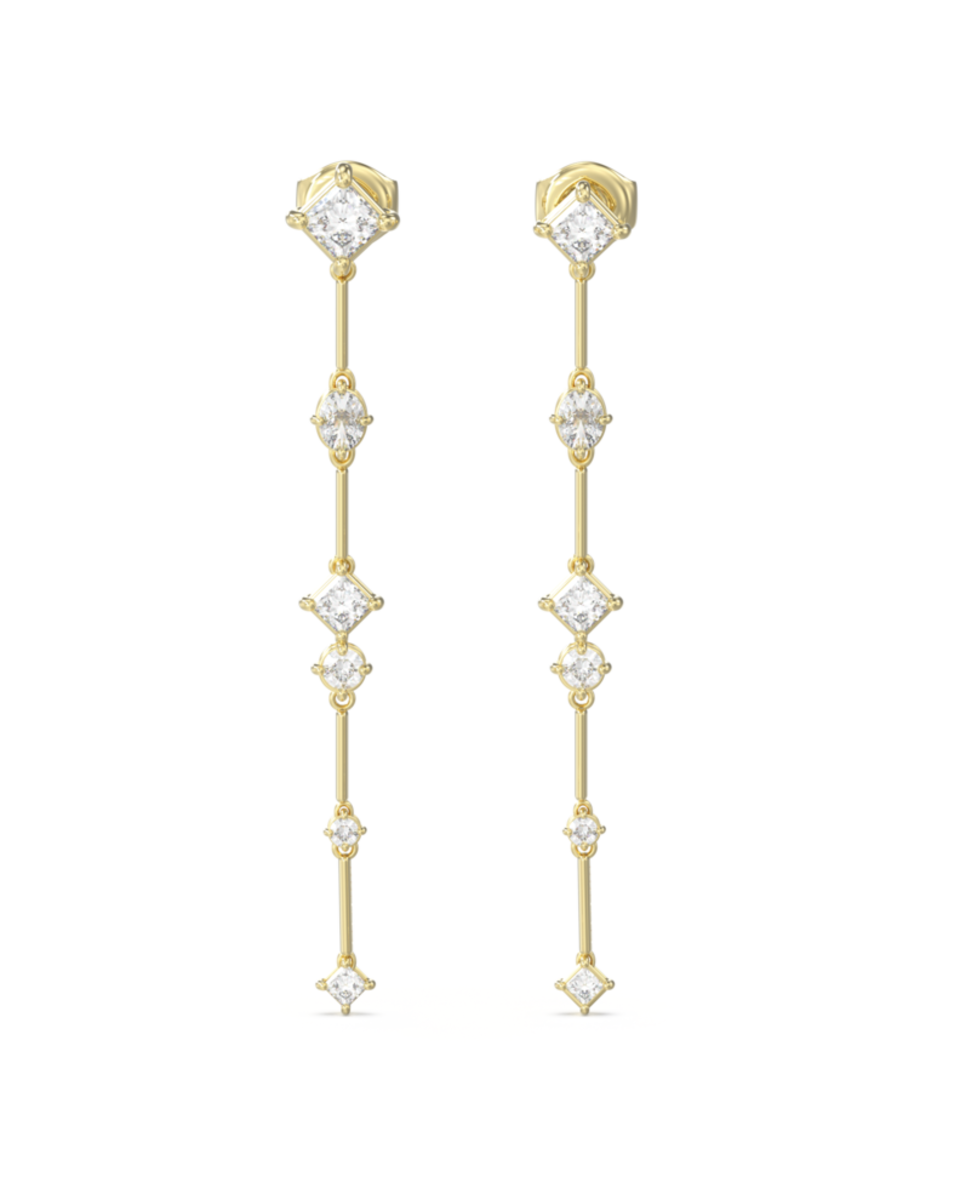 Pendientes de acero para mujer de la marca Guess. Pendientes dorados largos con cadena tubular y piedras decorativas. 68mm de largo. La colección Galaxy de la marca Guess te hará brillar como una estrella.