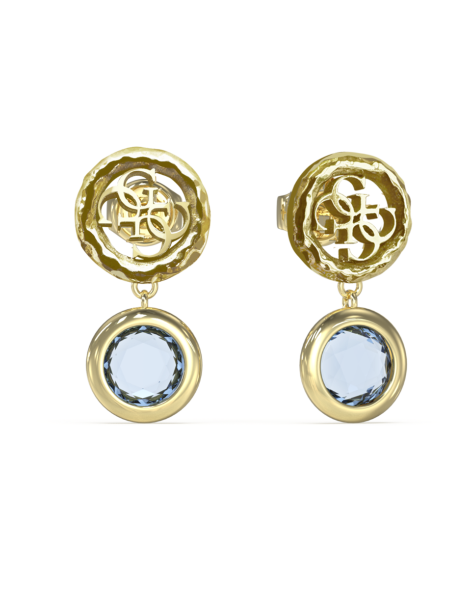 Pendientes de acero para mujer de la marca Guess. Pendientes dorados de botón con logo 4G y colgante de cristal azul. Inspirada en la vibrante paleta de colores de Petra