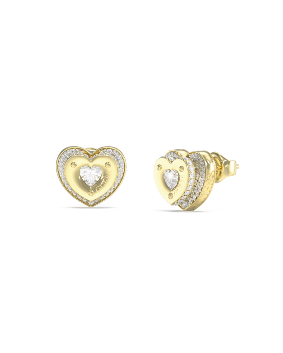 Pendientes de acero para mujer de la marca Guess.Pendientes dorados de botón con corazón como icono con diferentes alturas decoradas con pedrería. 12mm.