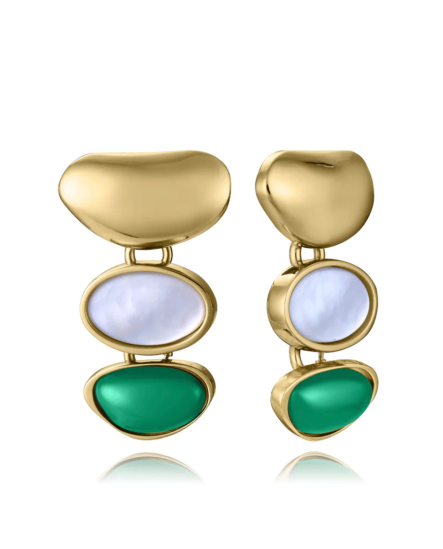 Estos elegantes pendientes de acero Ip dorado de la colección Laura Escanes presentan un sofisticado colgante de madre perla y una piedra natural desmontable, que aportan un toque de lujo y distinción.