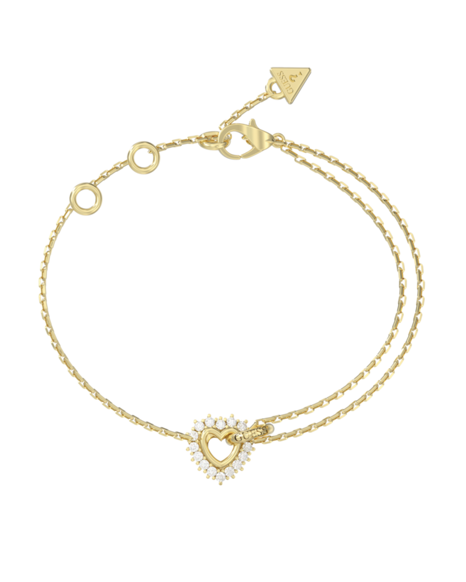 Pulsera de acero para mujer de la marca Guess. Pulsera dorada de doble cadena con corazón recubierto de pedrería. El amor sigue siendo la inspiración de esta colección sencilla pero elegante.
