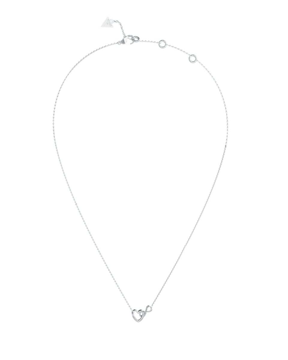 Collar de acero para mujer de la marca Guess. Collar plateado de cadena con corazón que se une al símbolo del infinito. El amor sigue siendo la inspiración de esta colección sencilla pero elegante.