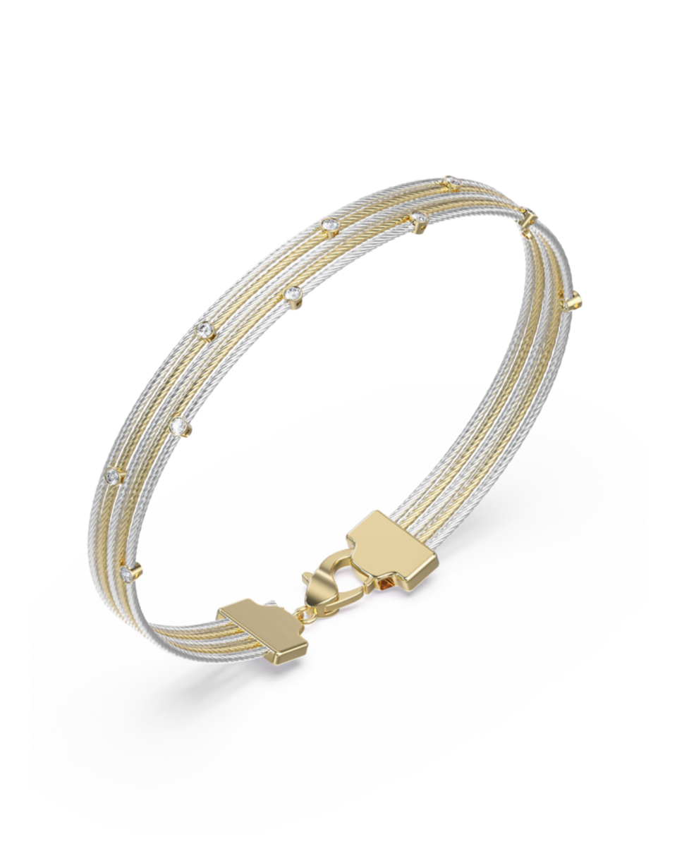 Pulsera de acero para mujer de la marca Guess. Pulsera dorada y plateada de cable con piedras decorativas. El estilo y el diseño toman forma en esta colección Kalybe gracias al uso de una especial cadena en forma de cable.