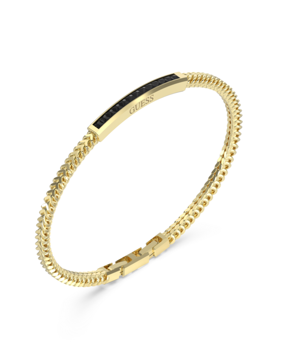 Pulsera de acero para hombre Guess. Pulsera dorada de cadena trenzada con pieza central con piedras en negro. El color negro es el protagonista de la colección Guess Noir. En pedrería, en lacados o en el color del acero