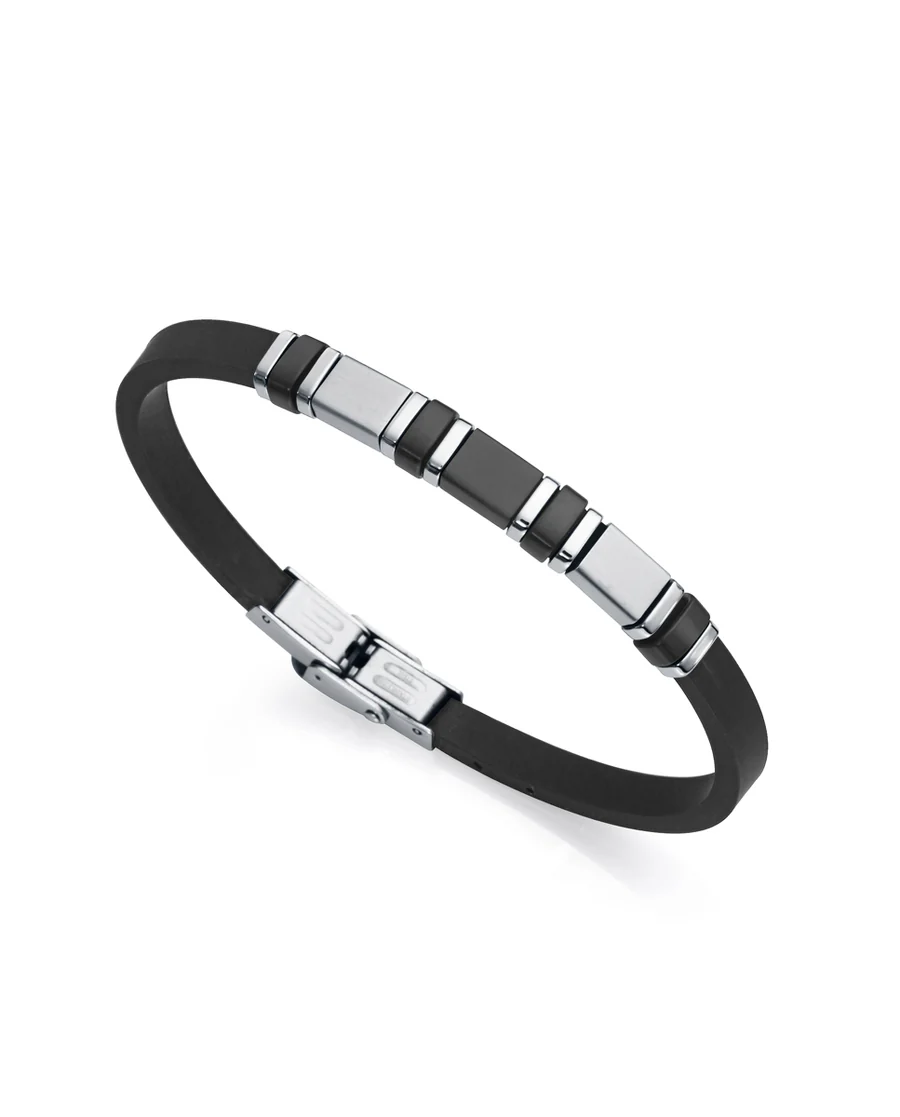 Descubre la sofisticación con nuestra pulsera de silicona negra y placa de acero con ip negro y silicona. Perfecto para añadir un toque de glamour a tu estilo diario, esta joya es una manifestación de nuestra dedicación a la artesanía y la belleza
