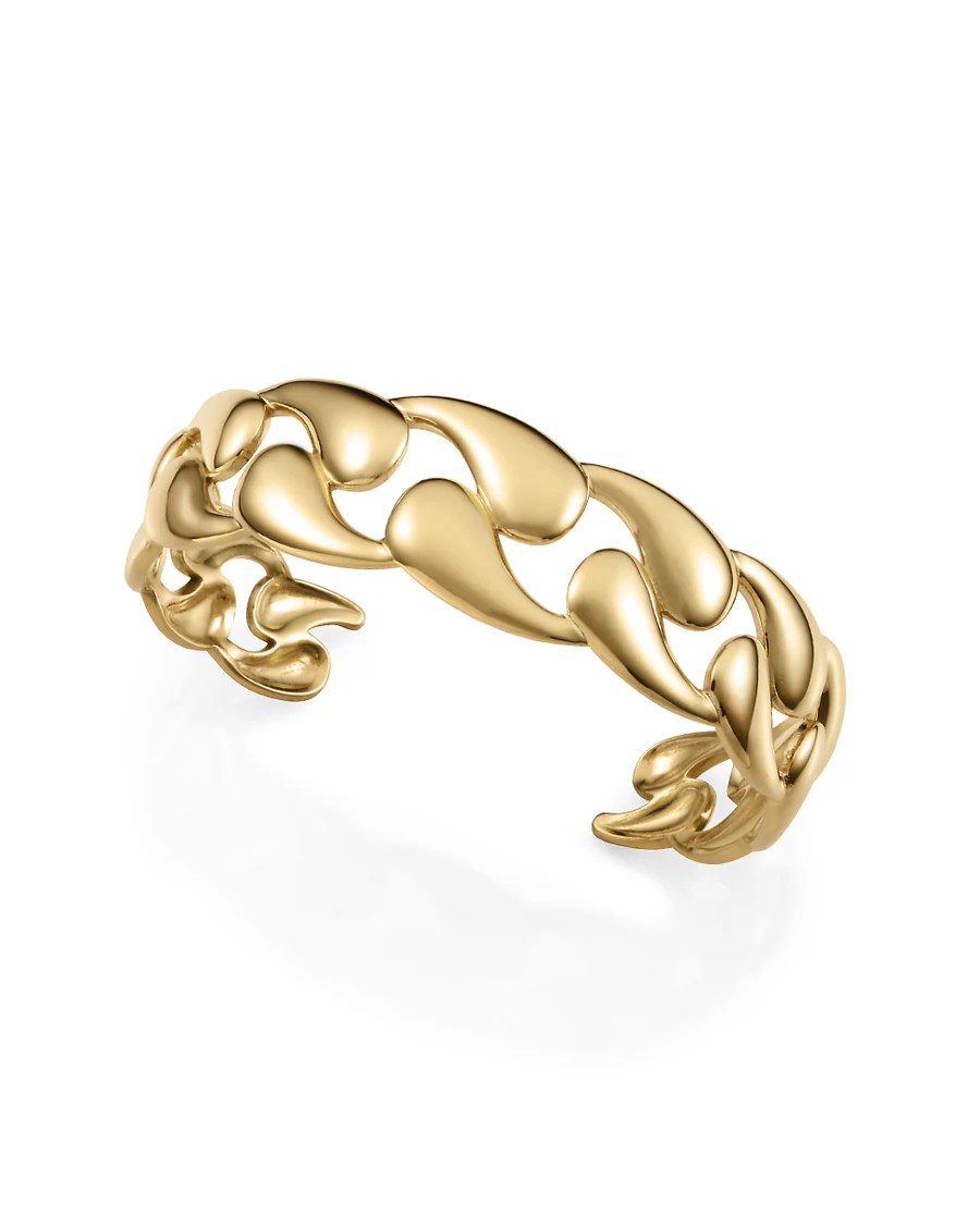 Una pulsera que destaca por su diseño contemporáneo y elegante. Fabricada en acero con acabado IP dorado, esta pulsera rígida presenta un diseño abierto con eslabones entrelazados que aportan dinamismo y sofisticación.