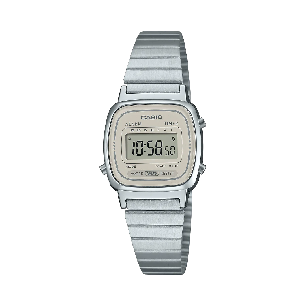Diseño clásico acentuado por tonos nostálgicos Los colores discretos de la esfera, en una gama de tonos grises, añaden un toque de estilo urbano retro a la combinación clásica de la caja cuadrada y la correa de metal. Este reloj digital está pensado para los amantes de la moda que quieren expresar su propio estilo sin perder de vista las últimas tendencias.