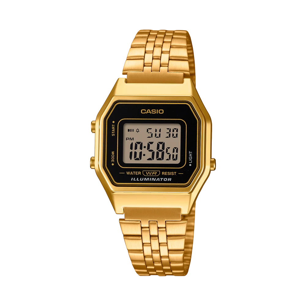 ronómetro de 1/100 segundos • Alarma • Iluminador LED • Resistencia al agua • Correa de acero inoxidable • Diseño retro popular