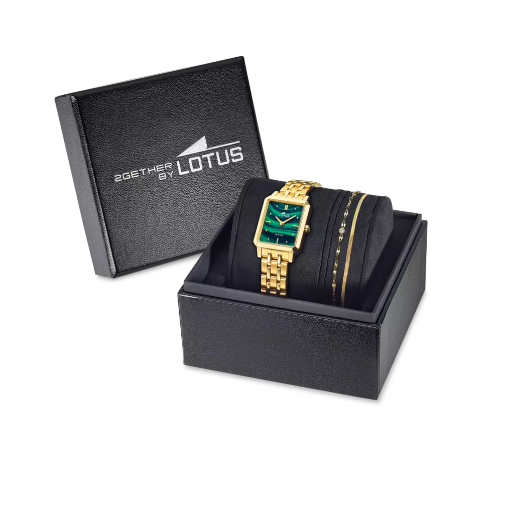 El Lotus 2Gether 19009/3 une la intensidad de su esfera verde con la elegancia de su caja rectangular en acero inoxidable, ofreciendo un diseño sofisticado y contemporáneo con aire Old Money. El conjunto incluye una pulsera a juego en un estuche regalo, perfecto para quienes buscan un obsequio exclusivo y con personalidad.
