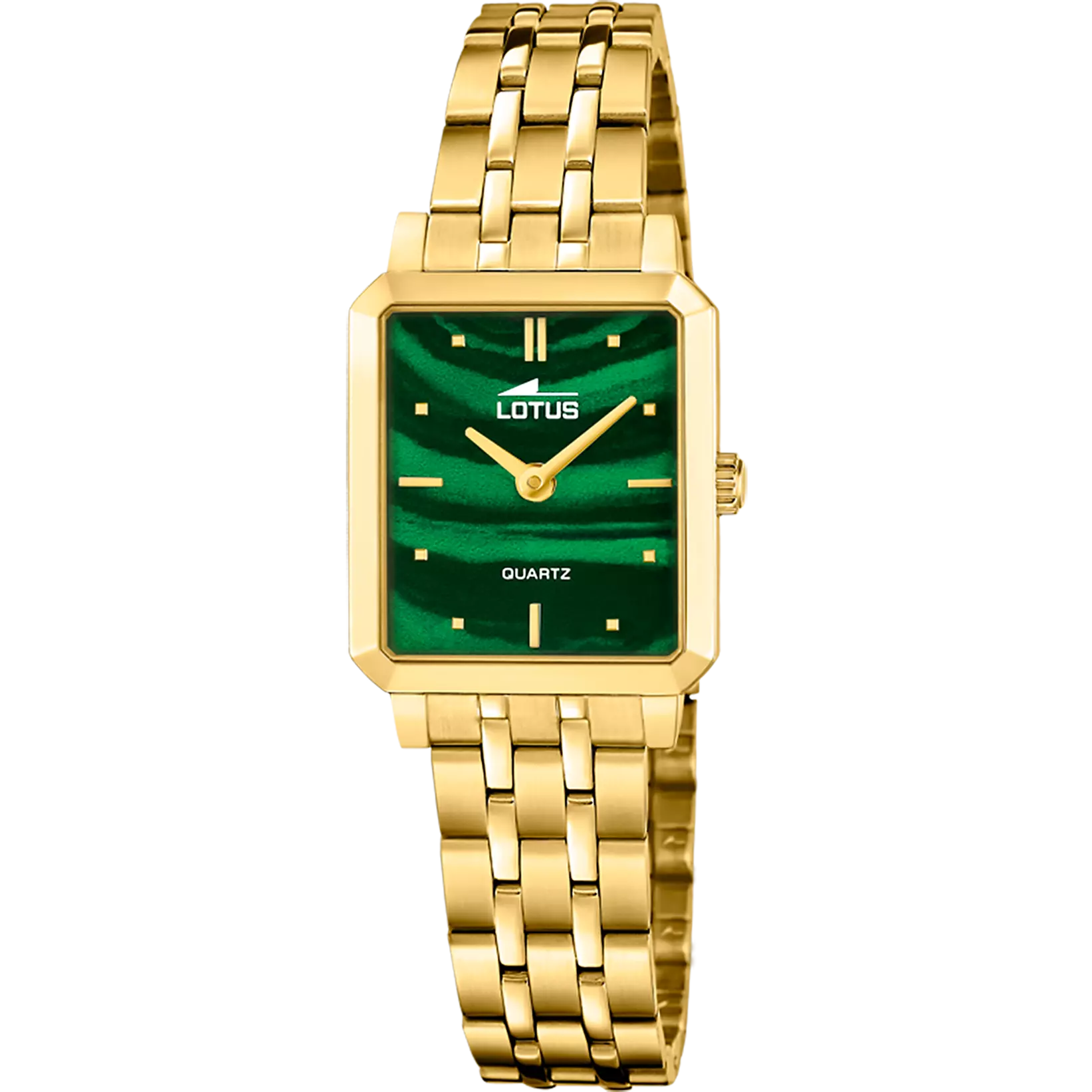El Lotus 2Gether 19009/3 une la intensidad de su esfera verde con la elegancia de su caja rectangular en acero inoxidable