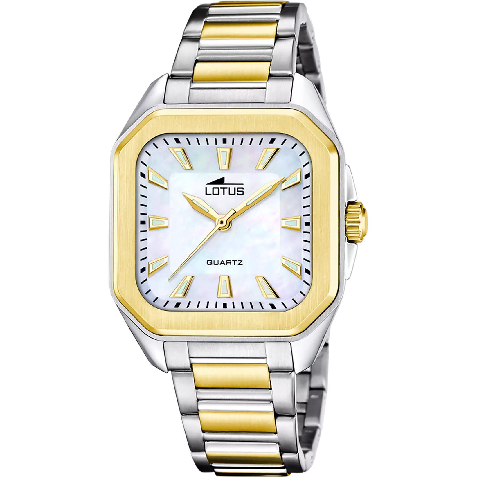 Este modelo de la Square Series se distingue por la elegancia de su esfera de nácar y la originalidad de su correa bicolor en acero inoxidable. Su caja cuadrada completa un diseño femenino y con estilo actual.