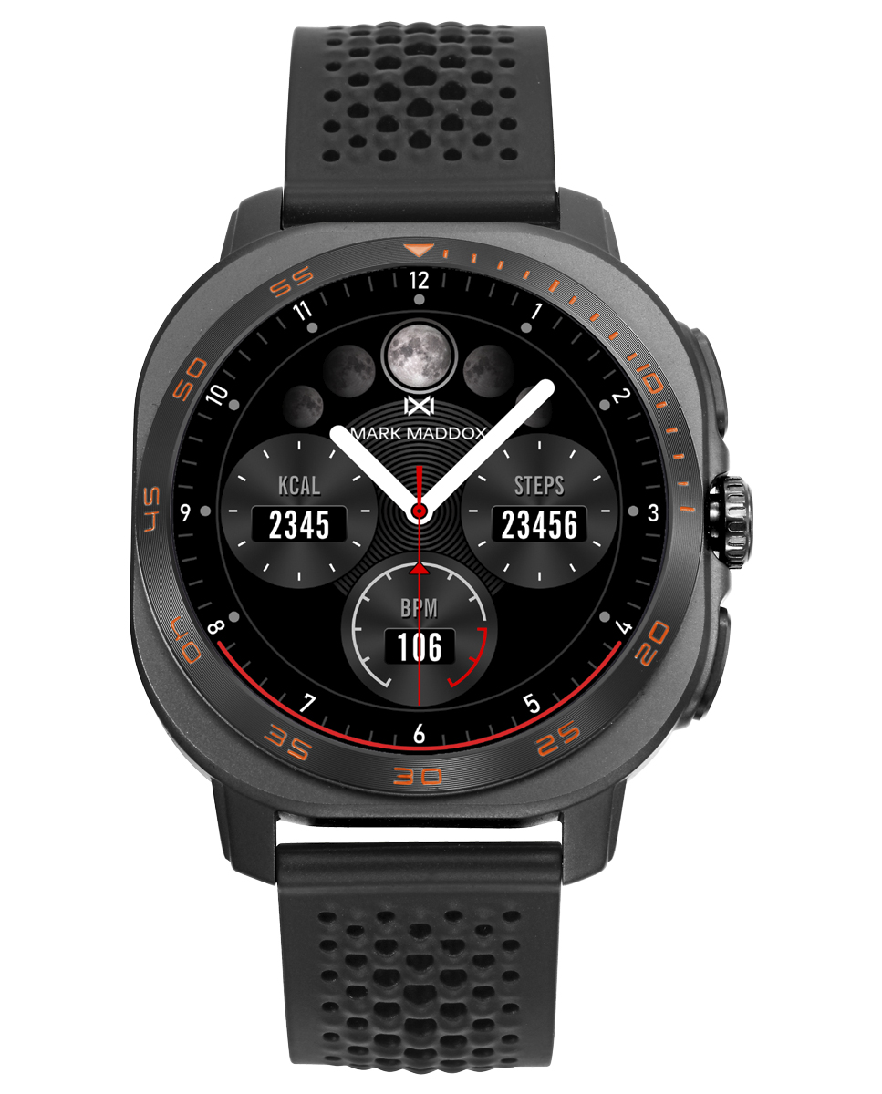 Reloj smart con caja metálica negra y correa de silicona a juego que refleja un estilo moderno y elegante. Su pantalla táctil ofrece una experiencia intuitiva para gestionar llamadas, mensajes y notificaciones, además de medir sueño, oxígeno y actividad física. Tecnología, diseño y funcionalidad en un reloj pensado para tu día a día.