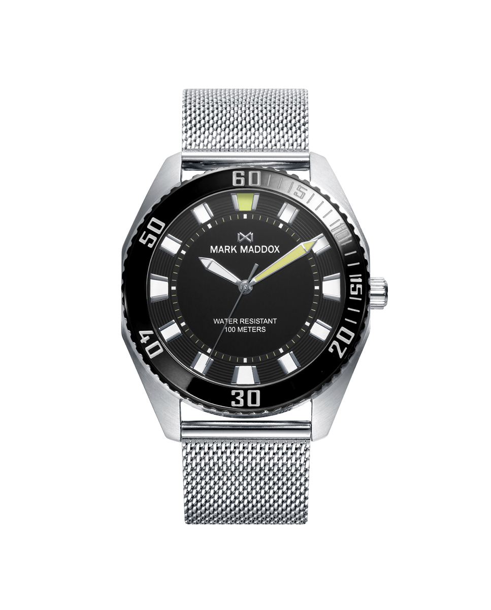 Reloj de Hombre Mark Maddox Mission tres agujas , caja y malla milanesa de acero, esfera negra , agujas bicolor en blanca y amarillo.