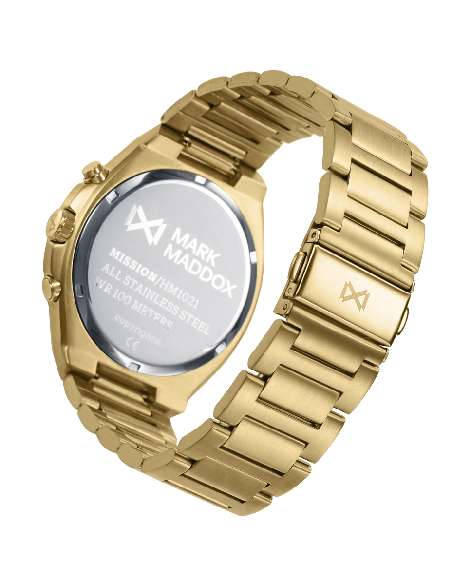 La caja de acero con acabado Ip dorado y el brazalete a juego dan a este reloj con cronógrafo para hombre un aire elegante y sofisticado. La esfera negra y verde, con índices en color Ip dorado, crea una armonía visual que resalta la calidad del diseño.