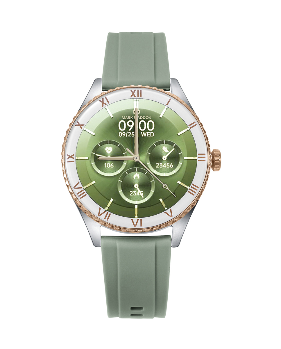 El smartwatch Mark Maddox Smartnow combina un diseño vanguardista y multifuncionalidad para acompañarte en cada momento del día. Su elegante caja de metal bitono en acero e IP rosa, junto con la correa de silicona verde, crean un contraste moderno y atractivo, ideal para quienes buscan destacar con estilo.